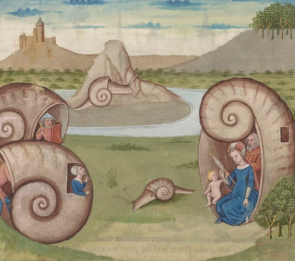 Traponee, f. 60v: “Solinus says that among the progeny of Traponee grow the biggest snails that exist in the world, and they move so quickly that it is a marvel, and the men of the country hunt and chase them as we over here hunt wild animals. And the people of the region live on their flesh. And the shells are so big that the men and women of the country live inside them, and they have no other houses or habitations. - from Kristen Figg and John Friedman’s translated transcription of the manuscript.
